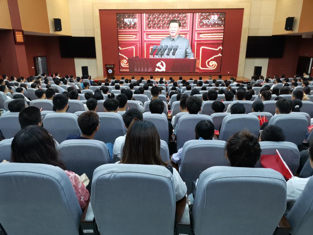 中华民族千秋伟业,百年恰是风华正茂,2021年7月1日,庆祝中国共产党成立100周年大会在北京天安门广场隆重举行,中共中央总书记、国家主席、中央军委主席习近平发表重要讲话。根据学校工作安排,学生工作部组织全体学工干部、学生党员代表420余人在鄠邑校区弘石学术报告厅收看直播。校党委副书记张木全程参与收看。
