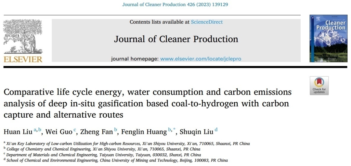 近日,我校化学化工学院黄风林、刘欢科研团队以刘欢为第一作者、西安石油大学为第一单位在能源环境领域国际权威学术期刊《Journal of Cleaner Production》(JCR、中科院分区双一区TOP期刊,IF=11.1)上发表题为《Comparative life cycle energy, water consumption and carbon emissions analysis of deep in-situ gasification based coal-to-hydrogen with carbon capture and alternative routes》的高水平论文。