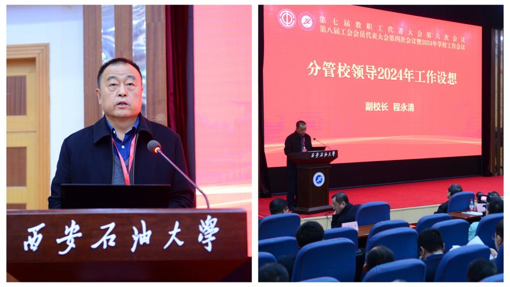 校长王进富作了题为《锚定目标加油干 实干担当创一流 奋力建设特色鲜明的高水平教学研究型大学》的工作报告。报告回顾了2023年的重点工作和主要成绩。报告指出,一年来,学校党的建设得到全面加强,学科专业建设成效显著,人才培养质量不断提高,师资队伍建设不断强化,科技核心竞争力持续提升,学生教育工作成效明显,开放办学格局不断拓展,办学条件保障持续改善。报告分析了当前学校发展的形势与挑战。报告强调,全校上下必须清醒地认识到学校发展存在的不足和薄弱环节,强化使命担当,树立忧患意识,大力弘扬“铁人精神”,聚力改革创新,抢抓发展机遇,坚持苦干实干,加快推进学校事业更高质量发展。