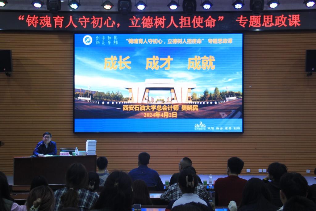 为深入学习贯彻习近平新时代中国特色社会主义思想和党的二十大精神,全面落实立德树人根本任务,4月2日,总会计师樊晓民以《成长、成才、成就》为题,为经济管理学院学生讲授“铸魂育人守初心,立德树人担使命”专题思政课。经济管理学院学生工作干部及各年级学生代表200余人参加。