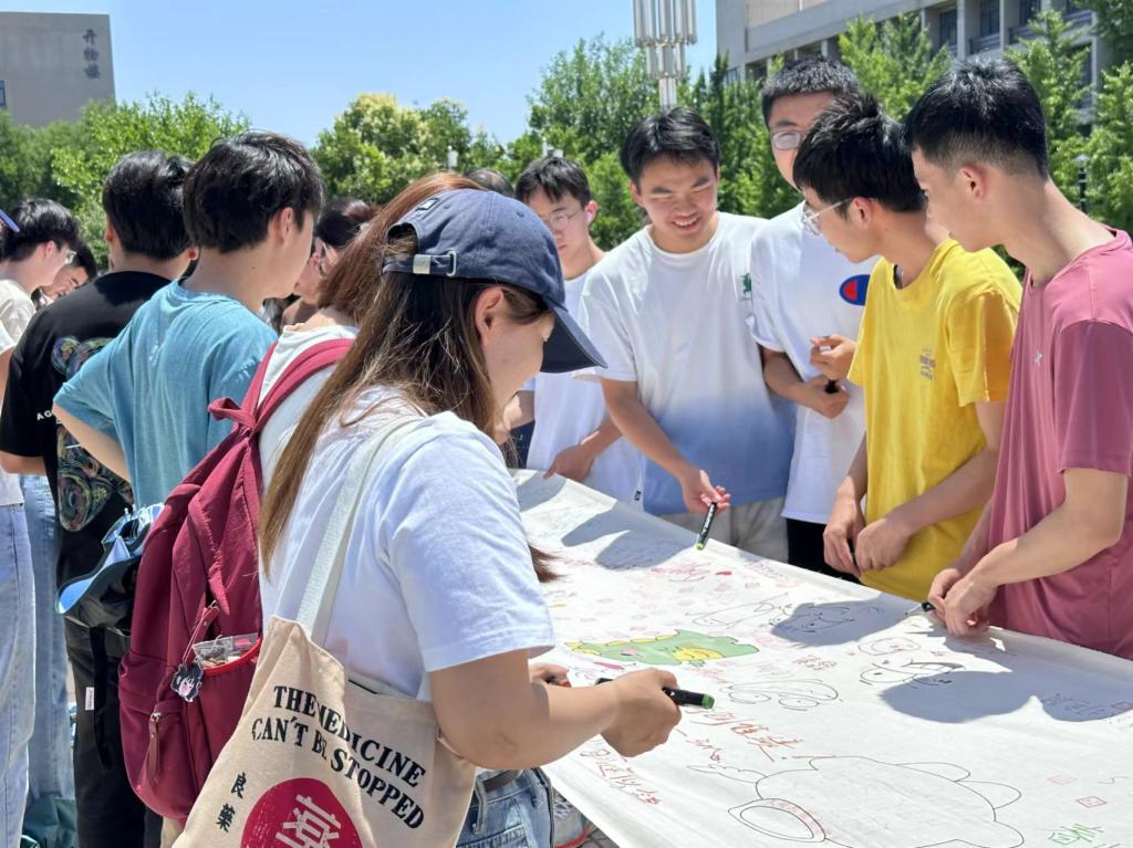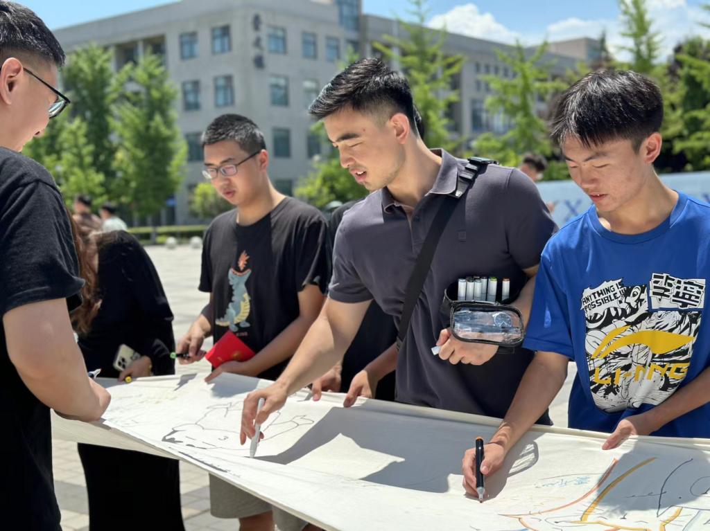 “辉煌明天长卷拓印”主题活动分别在鄠邑校区东区田径场和图书馆南广场展开。在田径场上,长长的画卷两旁围满了熟悉的毕业生身影,大家用自己天马行空的想象,或一人,或三三两两尽情地点墨挥毫、涂抹挥洒,表达离别之意。“山高水长,一路壮歌,看我辉煌明天”,长卷上的这行文字闪耀着同学们大学四年的青春,洋溢着曾经的点点滴滴,此事此刻,仿佛《辉煌明天》歌声响起,大学生活在这一刻重现,未来的日子在这一刻瞬间展望。现场除了毕业生,也有在校生为即将离别的学长学姐送来祝福,大家聚集在一起,用不同的绘画方式进行创作,同学们用歌声,用欢笑,用心语,用自己的方式为未来的自己送上最美好的期许,为即将分别的母校送上最深厚的祝福。经过数日的精心创作与准备,6月14日中午,“辉煌明天长卷拓印”主题活动终于在鄠邑校区图书馆南广场迎来了其收官之作,当一条长达50余米的长卷铺展开来,宛如一条历史的长河,见证着学校的发展历程和毕业生们的成长足迹。活动现场吸引了近千名师生踊跃参与、驻足观赏,现场师生用自己的画笔和色彩,在长卷上描绘出一幅幅充满创意和希望的画面,绘制现场热闹非凡,大家沉浸其中,充分施展才华,为长卷画龙点睛、锦上添花,共同展开创作这幅波澜壮阔的巨幅画卷。长卷中各具特色的创作形式,出自师生们的奇思妙想和独特创意,表达了毕业生对母校的不舍与感激,体现了老师们对学子最真挚的祝福与鼓励。当这条承载着毕业生们情感和回忆的长卷完成时,现场响起了热烈的掌声和欢呼声,毕业生们纷纷上前合影留念,将这份难忘的记忆永远定格在了这一刻。