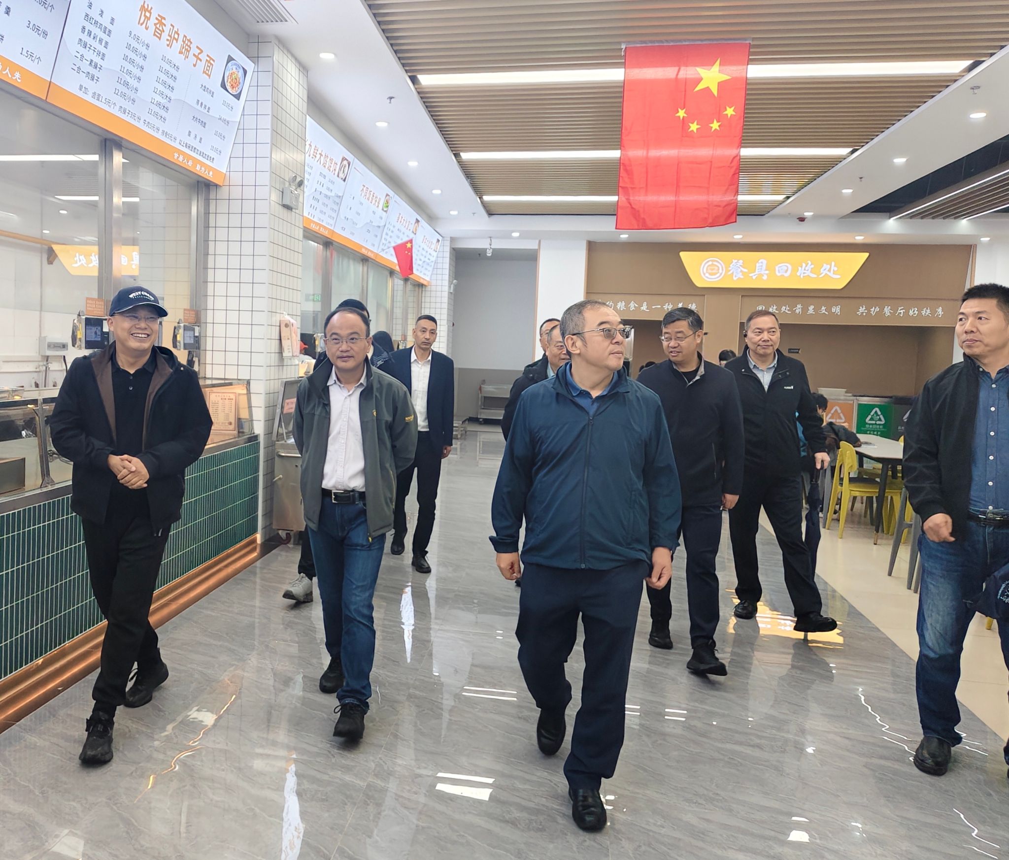 常江、王进富一行先后实地调研了初心广场建设维护及学生食堂管理相关情况,对初心广场的整体环境、设施维护、绿化养护和学生食堂的餐饮供应、菜品种类、食品卫生安全措施以及消防安全管理提出了具体要求,并强调:初心广场作为校园重要景观和标志性文化场所,其环境面貌直接反映了学校的治理水平,各相关部门务必加强日常巡查与维护,确保各类设施完好、环境整洁优美,同时要着眼长远,统筹规划,持续优化校园空间布局和功能品质;食堂工作是重要的民生工程,关系到师生的切身利益与健康安全,后勤部门进一步加强精细化管理,不断提升服务品质和保障能力,尤其是在节假日期间,必须时刻绷紧安全这根弦,严格落实各项规章制度,确保食品来源可靠、加工规范、价格合理,努力为师生营造安全、舒适、满意的就餐环境。