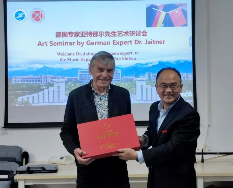 在专业交流环节,双方围绕艺术创新与国际合作展开深入对话。师生与Jaitner先生就传统音乐传承、音乐剧创作、爵士乐发展等核心议题进行了专业探讨。Jaitner先生结合国际视野提出建设性见解,为师生拓展了创作思路。会议还重点介绍了我校原创音乐剧《我为祖国找石油》,呈现音乐系在红色题材艺术创作方面的探索成果。针对师生关注的德国留学与学术交流事宜,Jaitner先生详细介绍了德国相关教育资源与文化环境,为有意赴德深造的师生提供了实用参考。