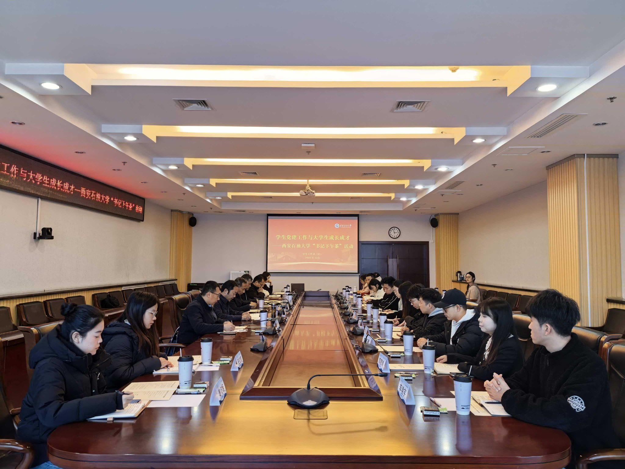 为进一步推进校园文化建设,丰富师生交流平台,切实倾听学子心声,助力青年学生成长成才,11月18日下午,我校“书记下午茶”活动在鄠邑校区图书馆第二会议室顺利举行。校党委副书记张木出席活动,与来自各院(系)的18名本科、硕士研究生围绕“学生党建工作与大学生成长成才”主题展开深入交流。党委组织部、研究生院、研究生工作部、校友工作与合作交流处负责人参会,党委学生工作部负责人主持活动。