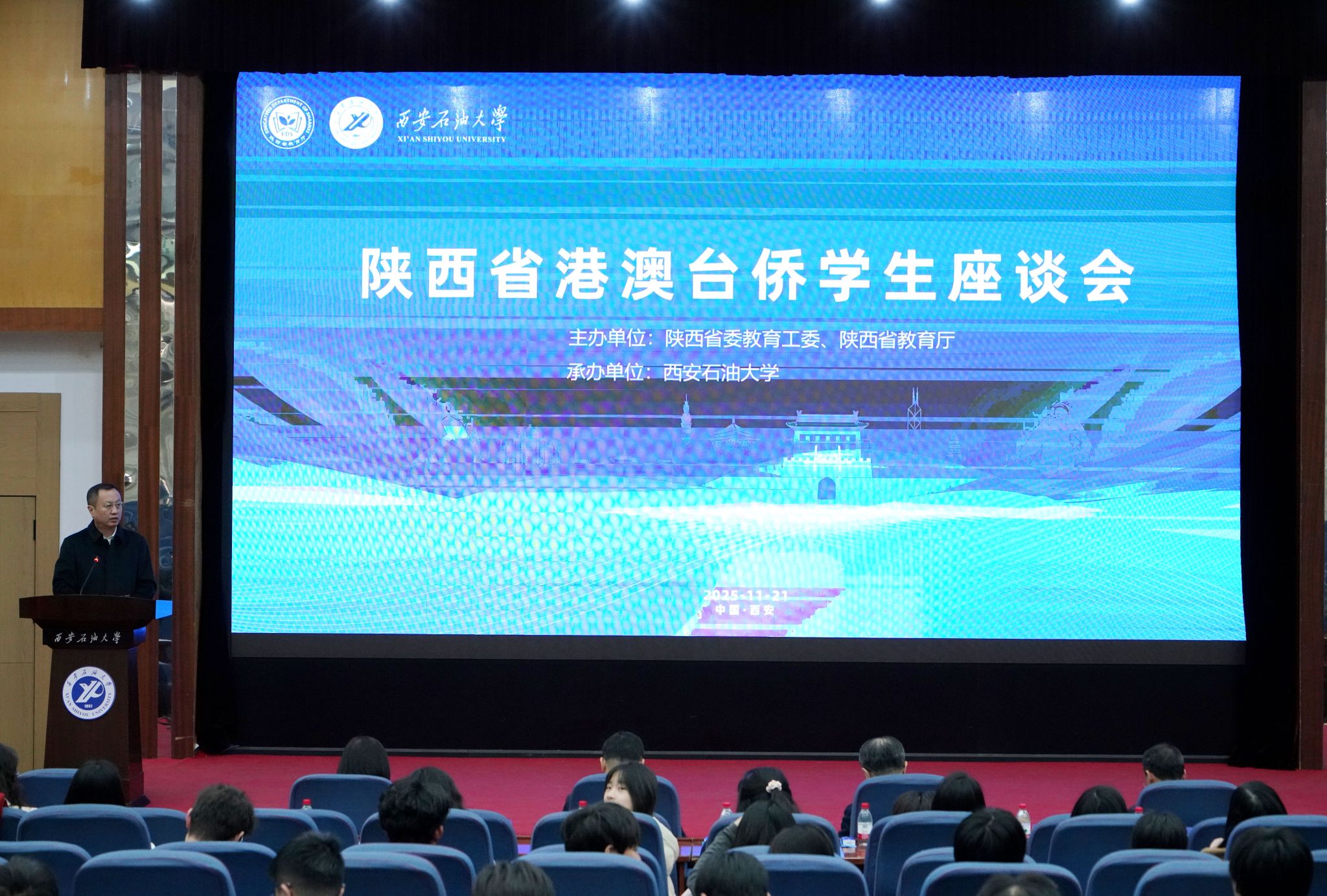 11月21日,由陕西省委教育工委、陕西省教育厅主办,我校承办的2025年陕西省港澳台侨学生座谈会在我校举行。会议以“精神铸魂,铁人砺志”为主题。陕西省委教育工委副书记王海波、陕西省委台办副主任王政君、香港驻陕西联络处主任陈静仪、我校校长王进富出席会议并致辞。陕西省委港澳办港澳工作处副处长薛瑞、陕西省教育厅港澳台办公室主任文通以及省内12所高校的60余名港澳台侨师生代表参加座谈,我校副校长张荣军主持座谈会。