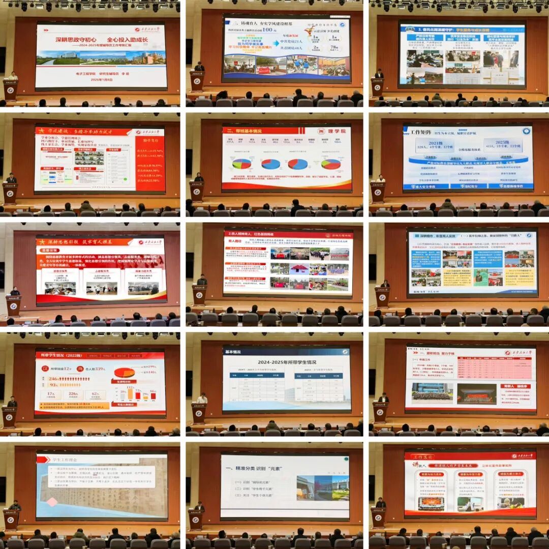 在院(系)汇报环节,16个院(系)负责人依次登台,围绕本学年学生工作核心任务,从思想引领、学风建设、党团建设、就业创业、心理健康、稳定安全等关键维度,通过翔实数据与生动案例,全面总结工作成效,深刻剖析短板不足,并明确下一年度“补短板、创特色、提质效”的具体举措。多个院(系)党政负责人结合学科专业特色补充汇报,充分彰显了院(系)协同联动推进学生工作的良好格局。