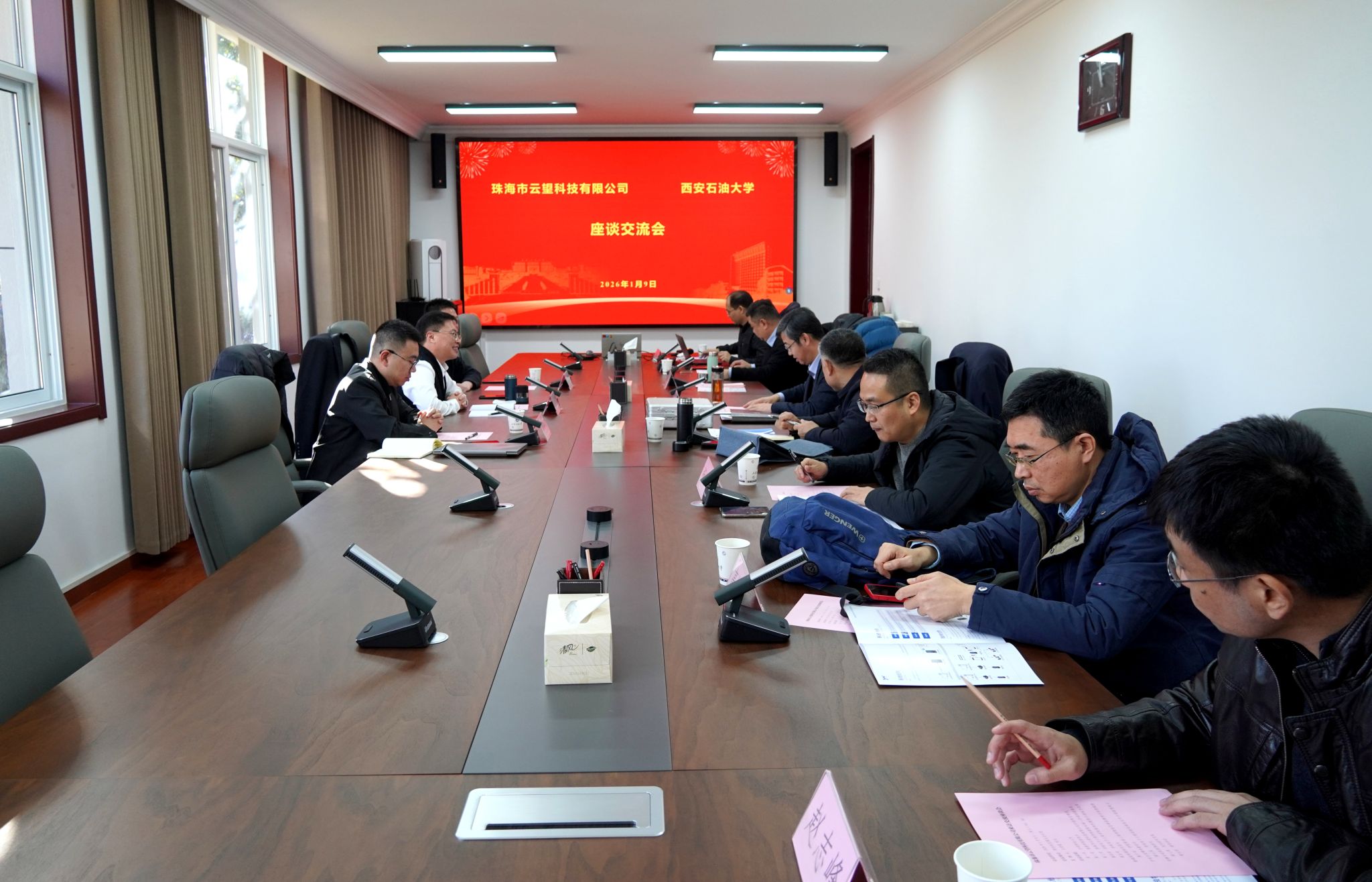 1月9日上午,珠海市云望科技有限公司创始人刘晋武一行来校就产学研深度融合相关事宜座谈交流。校长王进富主持会议并讲话。校友工作与合作交流处、电子工程学院负责同志及相关科研团队代表参加座谈。