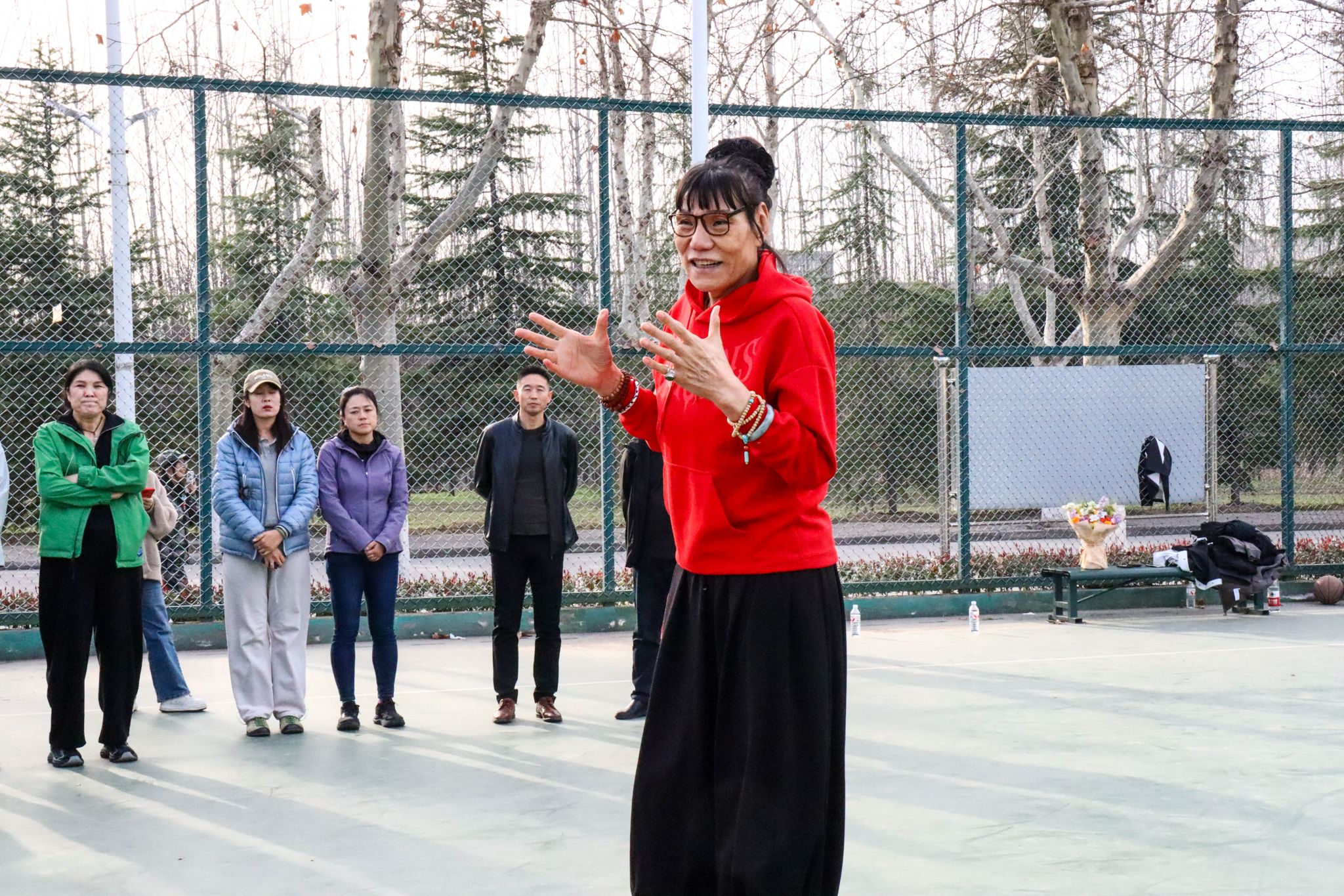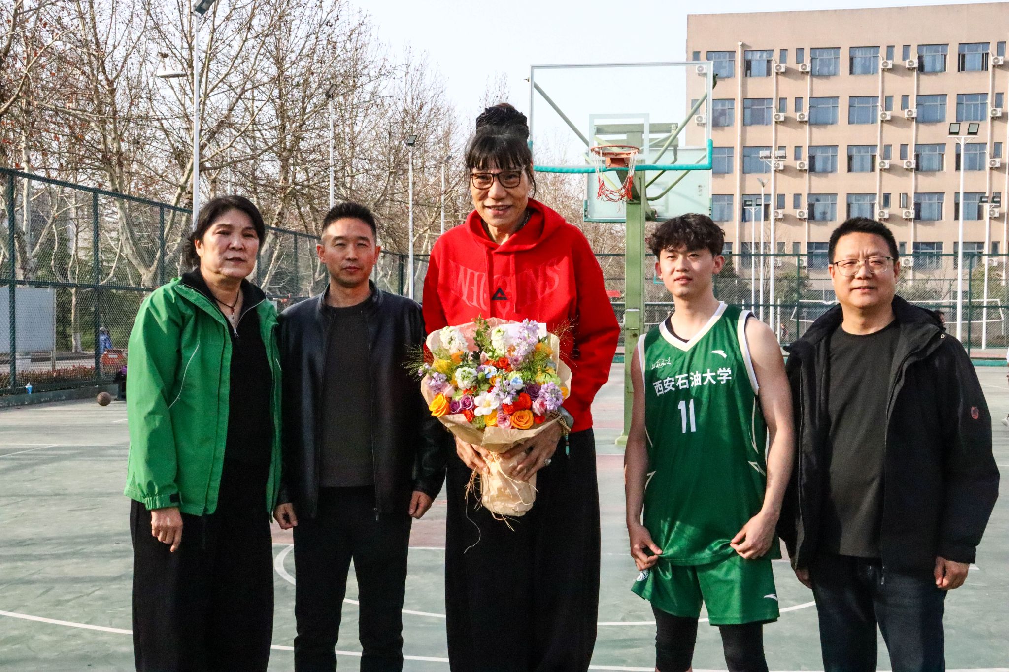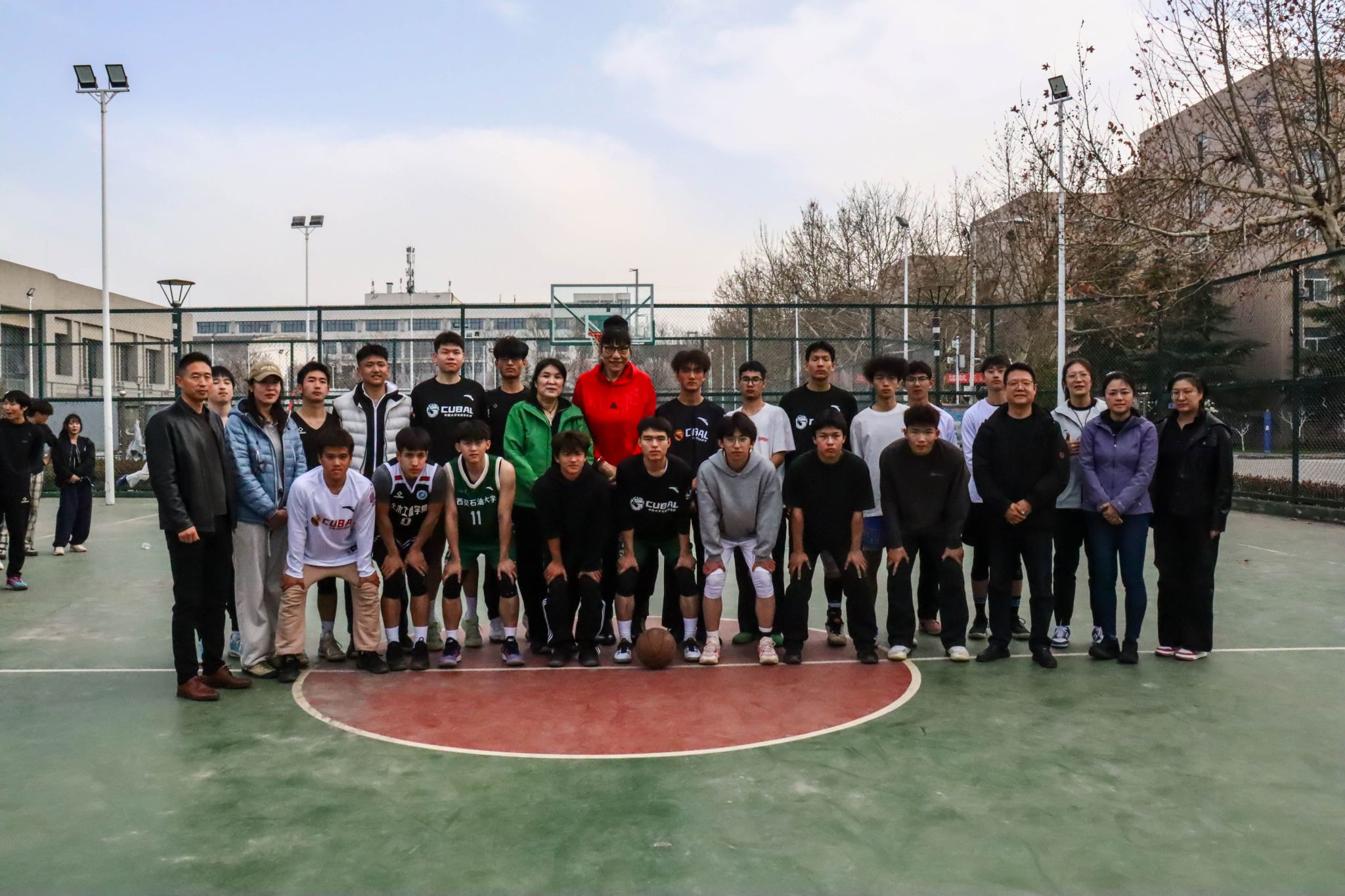 参观结束后,郑海霞前往东体育场篮球场,现场指导我校篮球队训练,并与队员们面对面交流。她结合职业赛场实战经验,分享训练技巧与比赛心得,叮嘱队员们夯实基本功、强化团队协作,在训练与比赛中团结奋进、勇攀高峰。