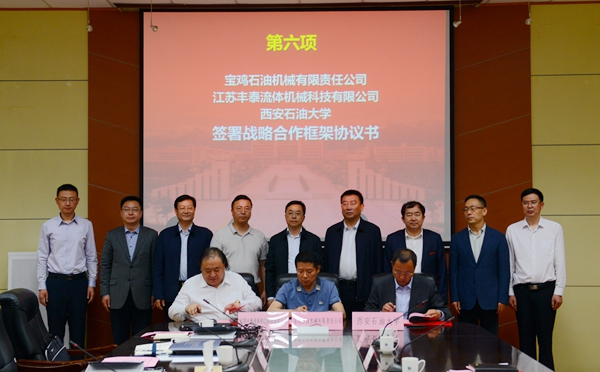 会上,宝鸡石油机械有限责任公司副总经理张斌、江苏丰泰流体机械科技有限公司董事长侯晓东、我校副校长张荣军分别代表校企政三方签署了战略合作协议书,我校材料科学与工程学院院长张骁勇、江苏莲源机械制造有限公司副总经理陈玉洪分别代表校企双方签署了技术服务合同。政企校三方科技部门、我校相关院系负责人就三方今后在石油机械领域科研合作、人才培养等方面的合作进行了深入探讨。
