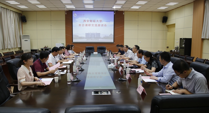 6月8日下午,西安财经大学党委副书记李国武一行7人来校调研交流,座谈会在雁塔校区第一会议室召开。校党委副书记雷西合出席座谈会。宣传部、学生工作部、工会、校团委负责人参加了会议。
