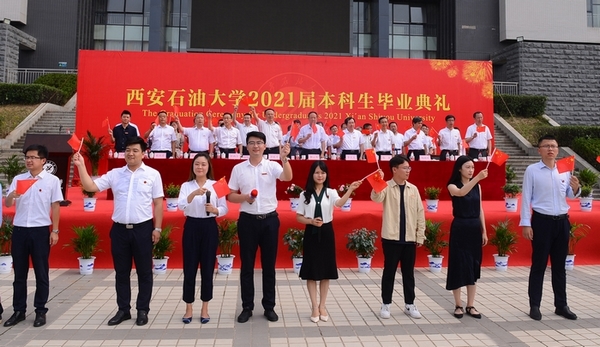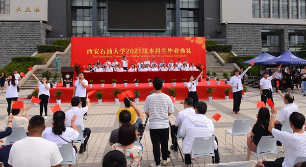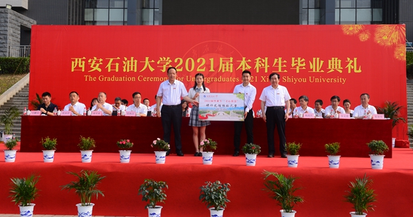 副校长陈军斌宣读了《西安石油大学关于2021届本科学生准予毕业、颁发毕业证和授予学士学位的决定》,副校长杨战社宣读了《西安石油大学关于表彰2021届优秀毕业生的决定》,校党委副书记雷西合宣读了《西安石油大学校友总会关于聘任2021届年级校友理事的决定》。与会校领导为优秀毕业生代表颁发了荣誉证书,为年级理事代表颁发了聘任证书和纪念品,并向毕业生代表赠送了“原油”印章纪念品。