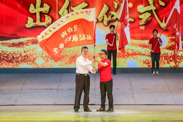 出征仪式上,我校地球科学与工程学院2021届资源勘查工程专业本科毕业生毕昆作为赴青海省基层就业毕业生代表,接受方光华副省长授旗(经毕昆授权代领)。
