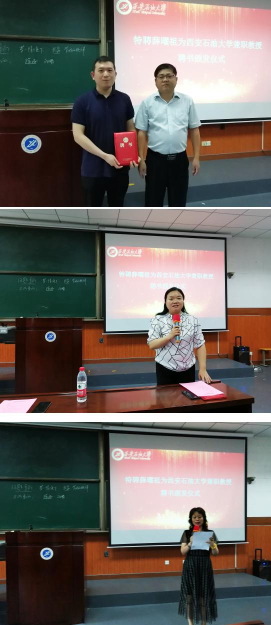 7月1日,特聘薛曜祖为西安石油大学兼职教授聘书颁发仪式在我校雁塔校区东阶201教室举行。学校总会计师樊晓民,经济管理学院相关负责人及师生代表80余人参会,聘书颁发仪式由教师工作部部长武晓朦主持。