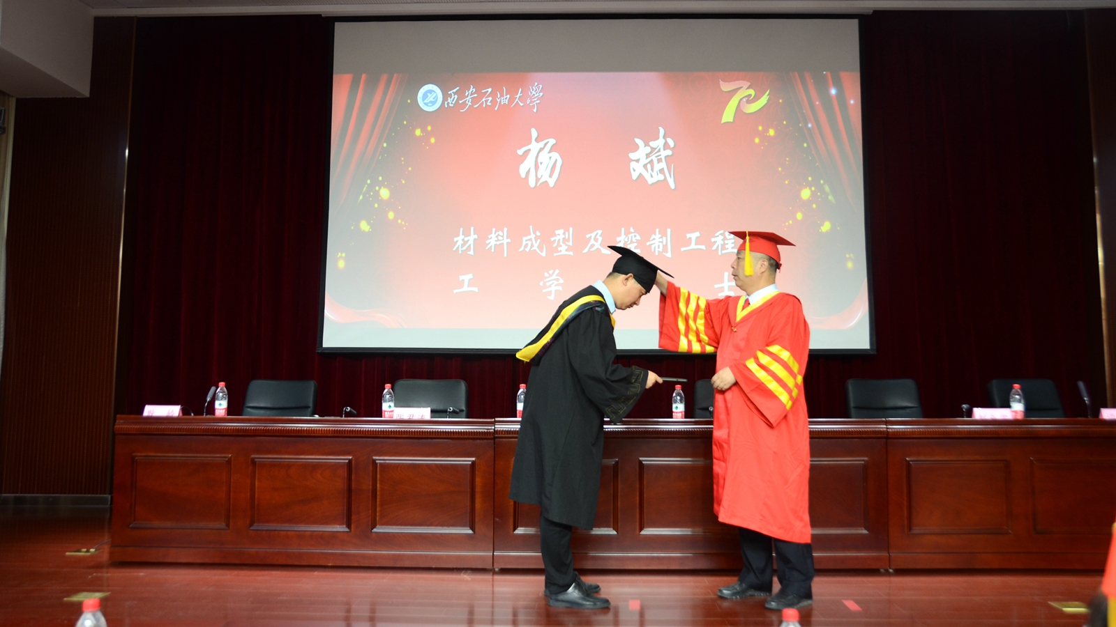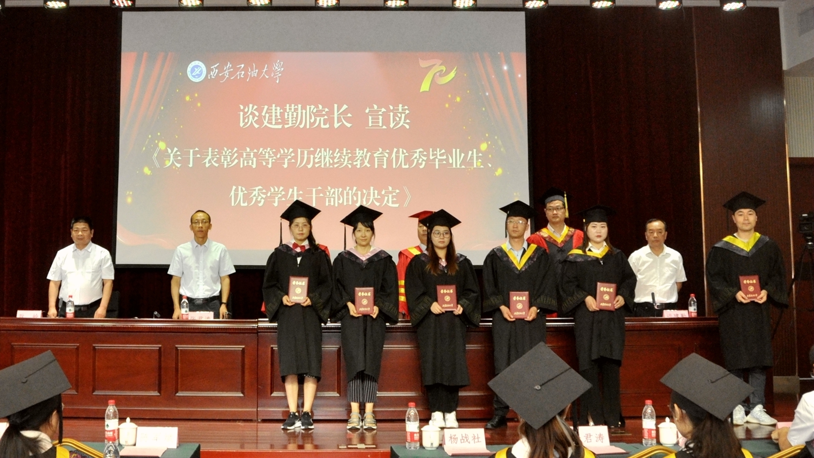 学位授予仪式在庄严的国歌声中拉开序幕。首先,校学位评定委员会委员、继续教育学院院长谈建勤宣读《西安石油大学关于表彰高等学历继续教育优秀毕业生、优秀学生干部的决定》,与会领导和导师为获得荣誉的优秀学生代表颁发荣誉证书。