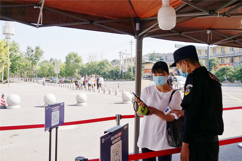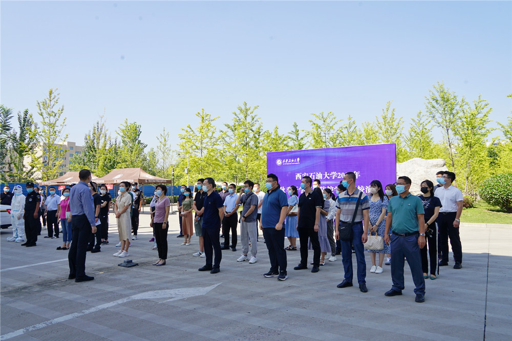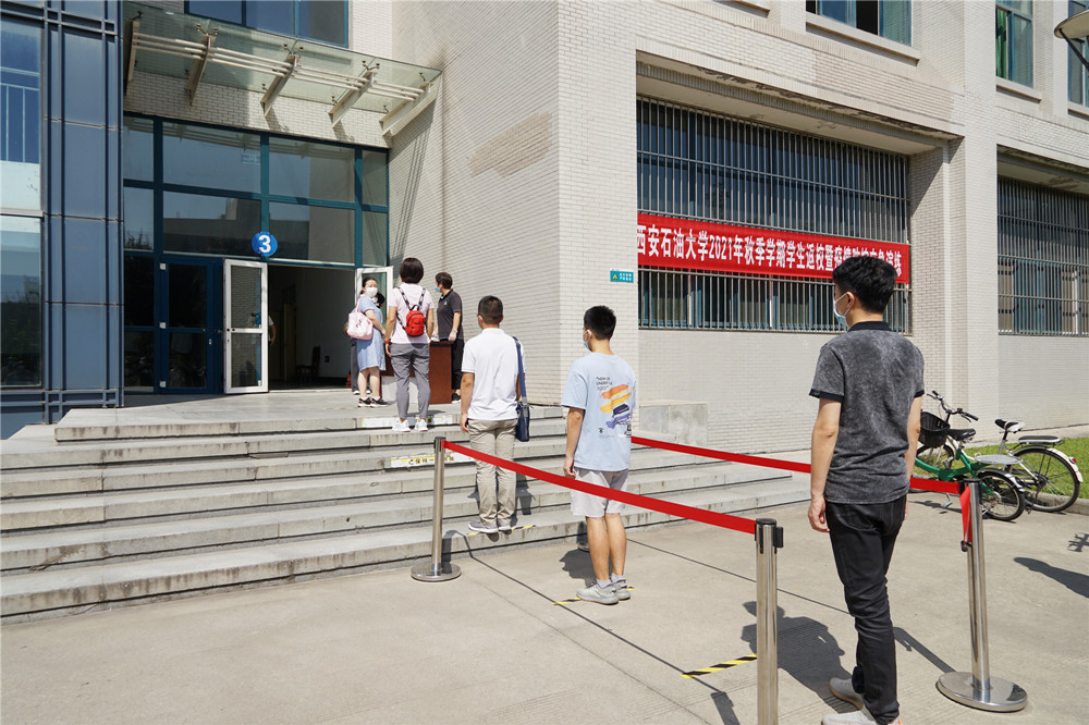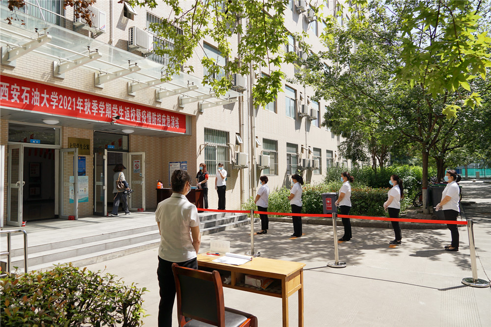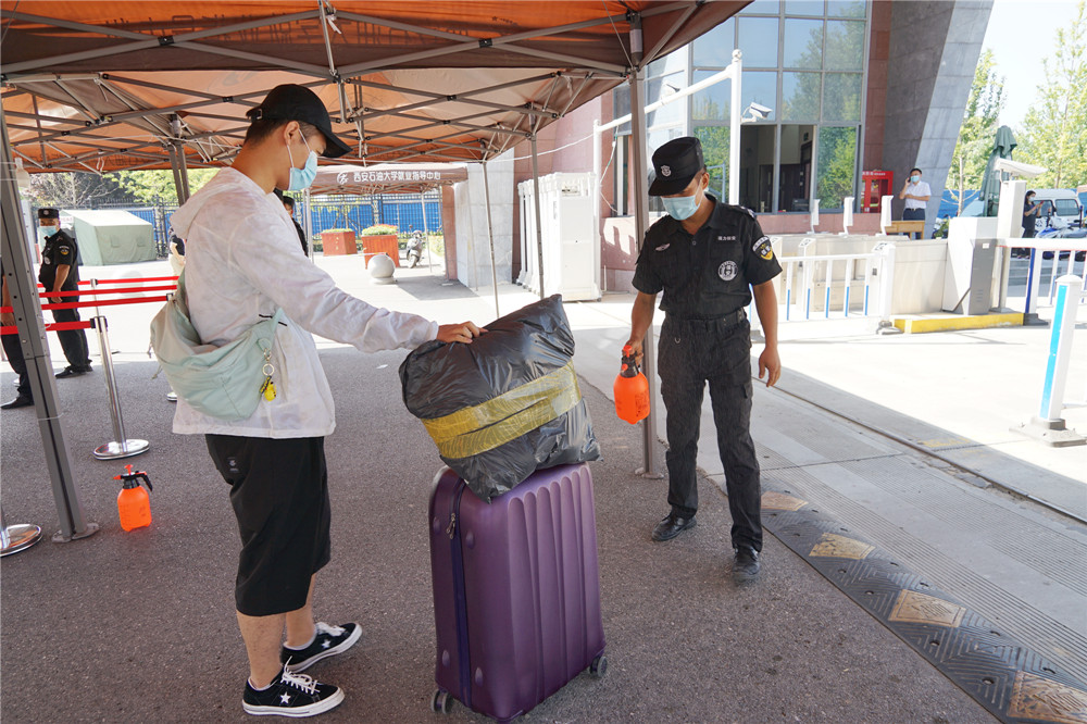 在鄠邑校区东门演练现场,返校学生按照地面标线,间隔一米有序排队准备入校,在工作人员引导下间隔1米有序排队接受进校检查,经过工作人员引导、体温检测、身份核验和健康码、大数据行程码查验、行李消毒等程序后有序安全入校。对健康码显示“黄码”或“红码”以及体温出现“异常”的同学,工作人员迅速分隔第一现场,疏散周围人群,将该学生带至临时留观点再次复核,仍显示异常者,立即启动应急处置。