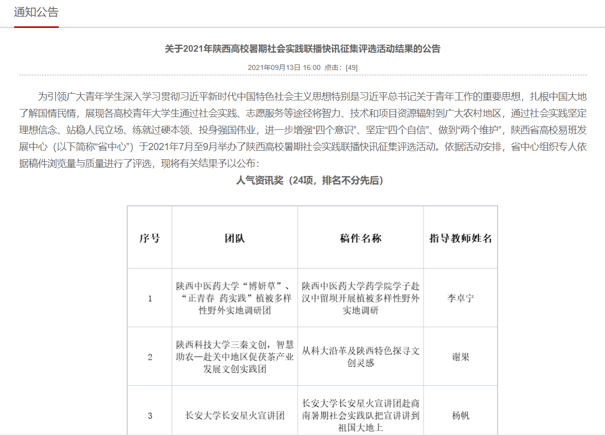 近日,由陕西高校网络思想政治工作中心组织开展的“关于2021年陕西高校暑期社会实践联播快讯集”评选结果公布,我校材料科学与工程学院“红色寻访”社会实践团队从全省6752支队伍中脱颖而出,与其他23支队伍一同获得了“人气资讯奖”,材料类2004王智辉获得活跃通讯员奖。