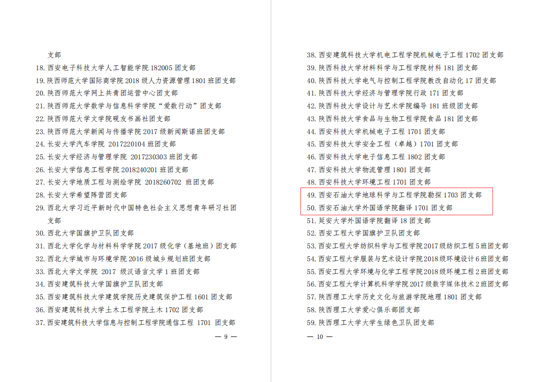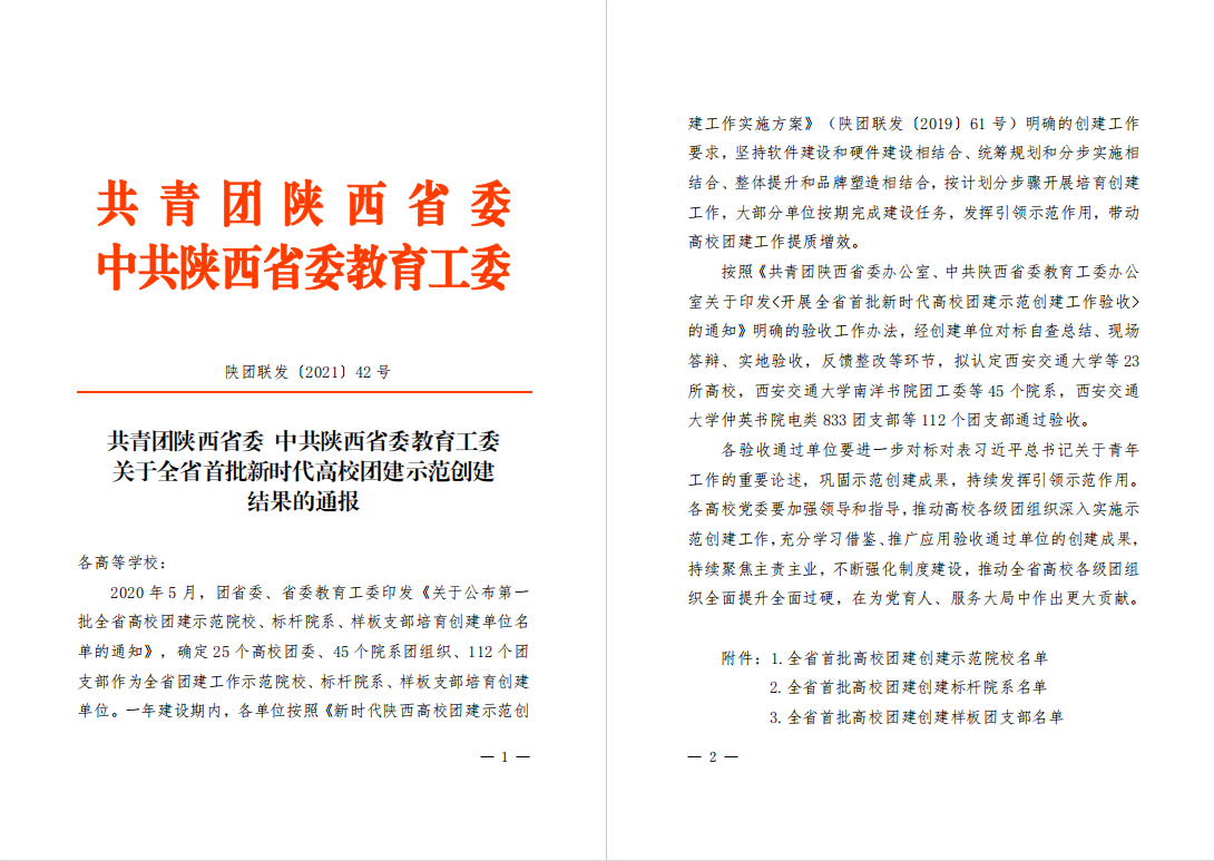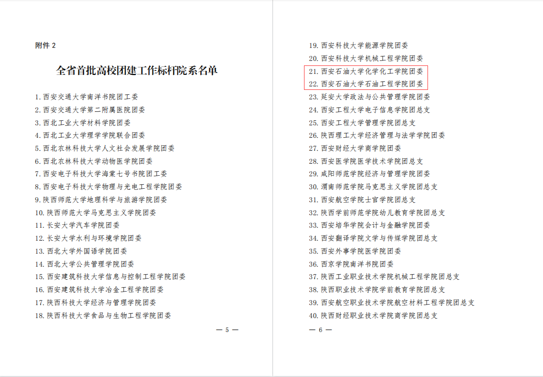 近日,共青团陕西省委、中共陕西省委教育工委公布了《关于全省首批新时代高校团建示范创建结果的通报》,我校石油工程学院团委、化学化工学院团委通过“全省高校团建标杆院系”验收,地球科学与工程学院勘探1703团支部、外国语学院翻译1701团支部通过“全省高校团建样板支部”验收。