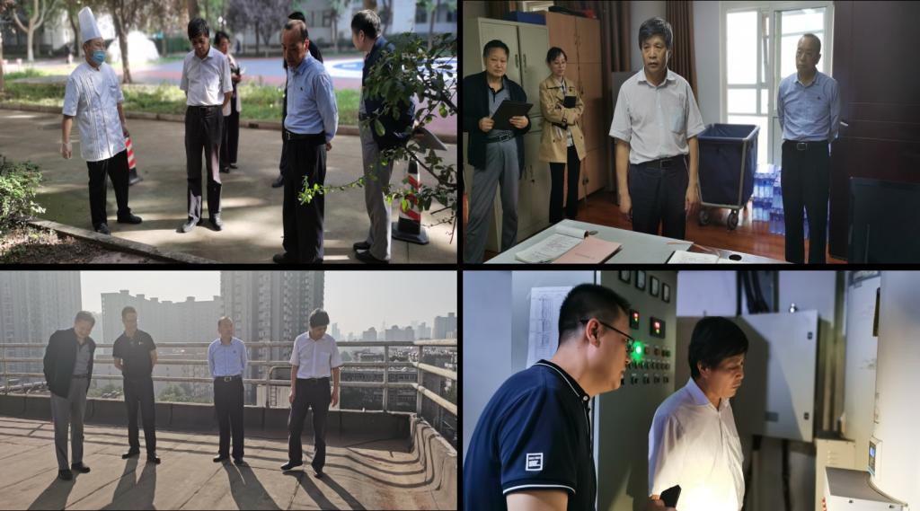 杨战社副校长一行先后对学院餐厅后厨、客房、隔油池、培训中心北楼楼顶、培训南楼地下室锅炉房等重点部位进行了仔细检查,听取了各部位负责人的工作汇报,针对可能出现的安全隐患,要求学院持续加强排查,并对培训中心北楼楼顶漏水给出了修缮意见。同时,他还听取了学院在常态化疫情防控下所采取的各项举措,对门卫外来人员登记、检查行程码工作进行了检查。
