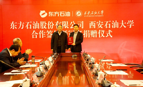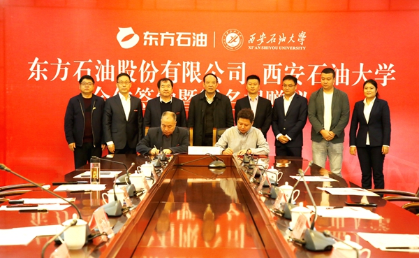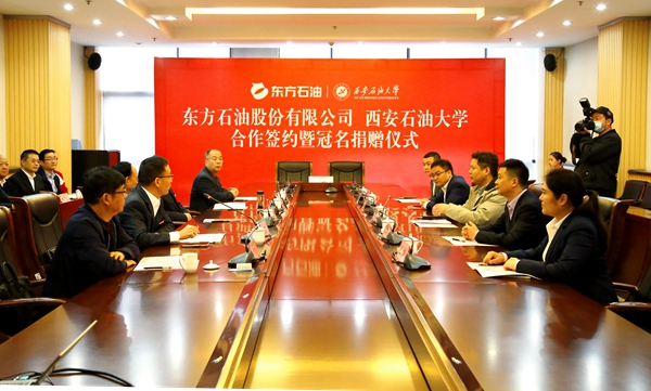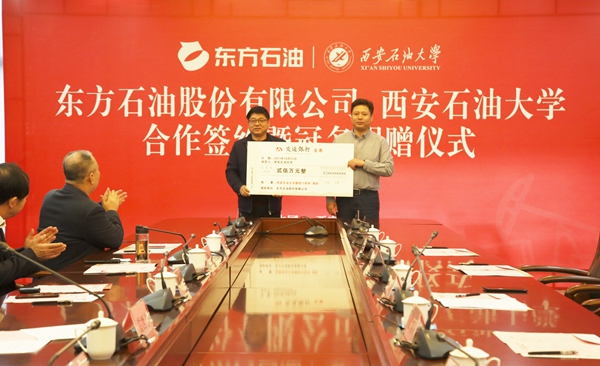 10月12日上午,我校与东方石油股份有限公司合作签约暨冠名捐赠仪式在鄠邑校区图书馆第二会议室举行。东方石油股份有限公司董事长兼总经理刘浩、副总经理姜涛、吴伟,财务总监毛维维、副总经理潘英,我校党委书记赛云秀、校长李天太、副校长陈军斌、总会计师樊晓民出席会议,会议由校党委副书记雷西合主持。