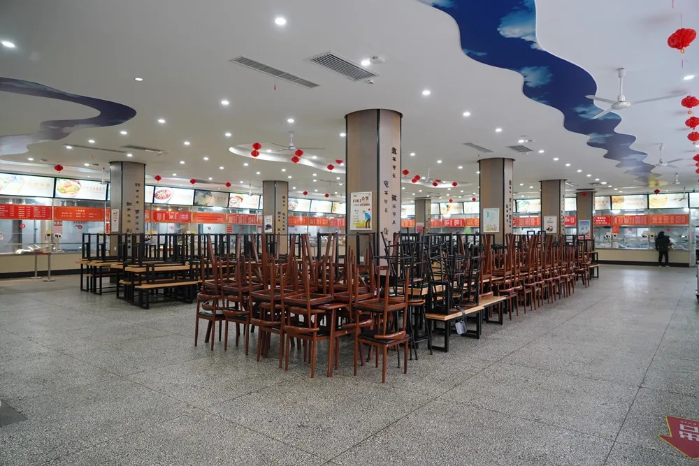 科学制定、动态调整就餐方案,除集中保洁消杀时段,两校区校园餐厅加强供应,每餐每个宿舍指派一人前来取餐,禁止堂食。