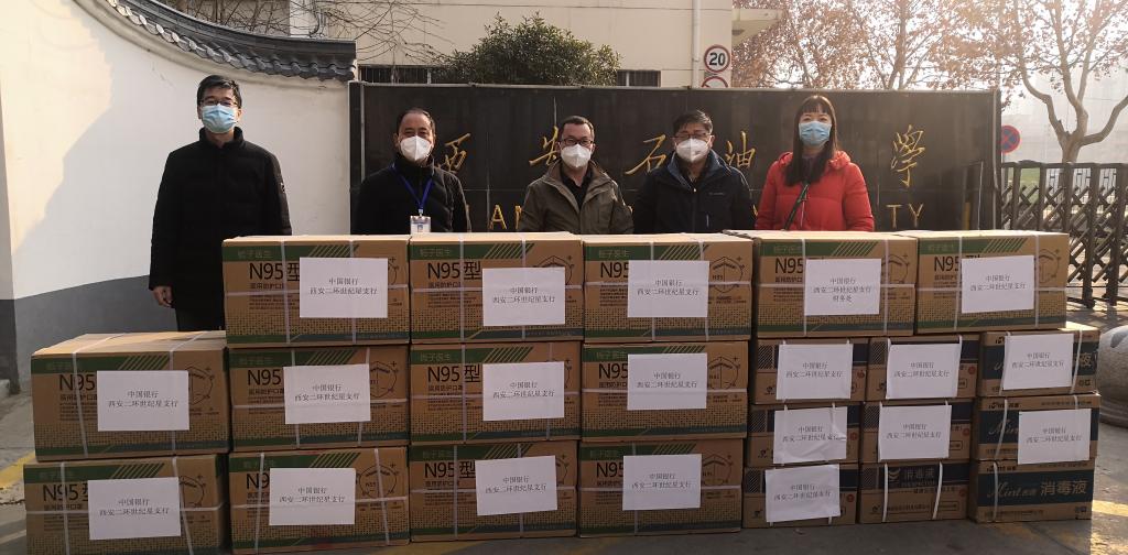 1月3日,经我校总会计师樊晓民联系,中国银行西安二环世纪星支行为我校捐赠一批疫情防控物资,其中包含N95医用防护口罩10300只,酒精225升。