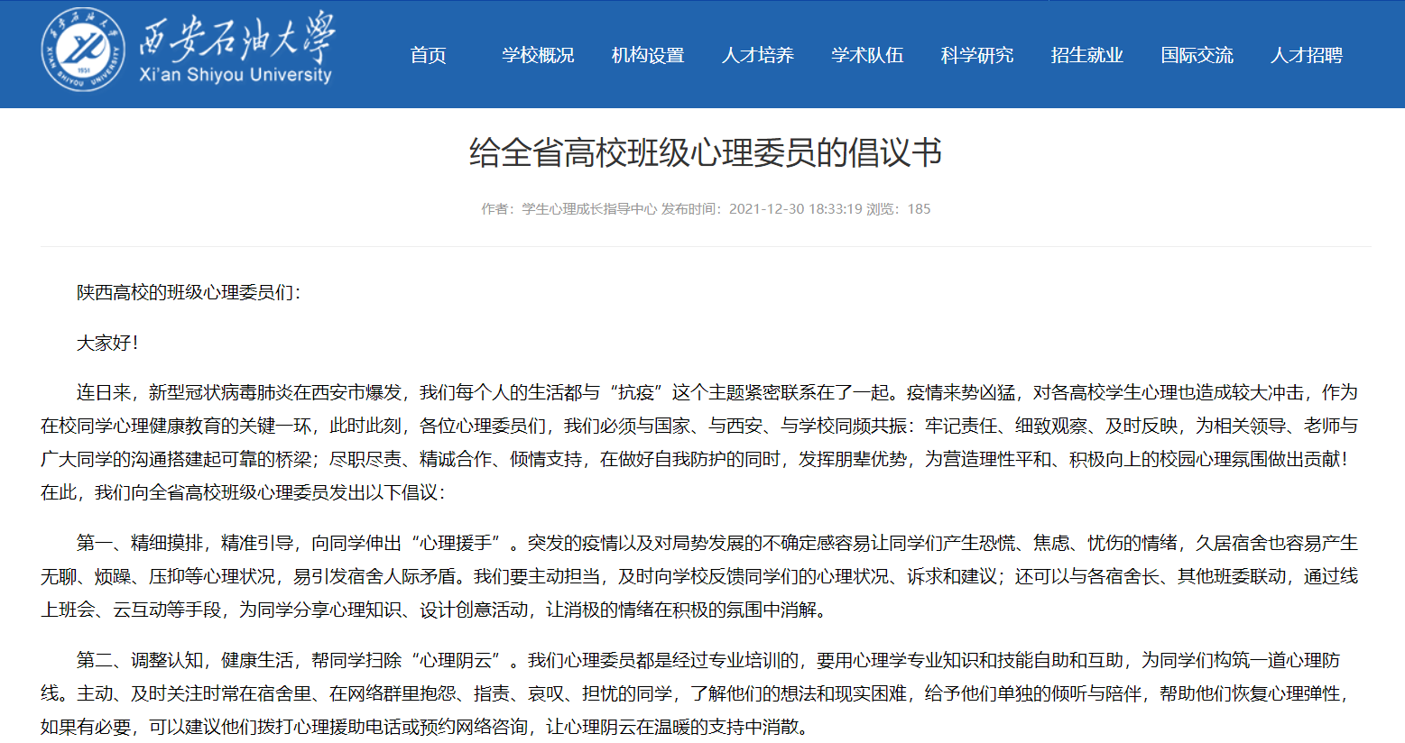 自12月16日学校党委安排部署疫情防控工作以来,党委学生工作部、研究生工作部密切联动,各院(系)党委(总支)积极配合,迅速启动学生工作干部24小时在岗、鄠邑校区每周轮值等工作制度,确保一线工作力量充足,全方位有序做好思想教育引导、政策法律宣传、卫生防疫知识学习等工作。