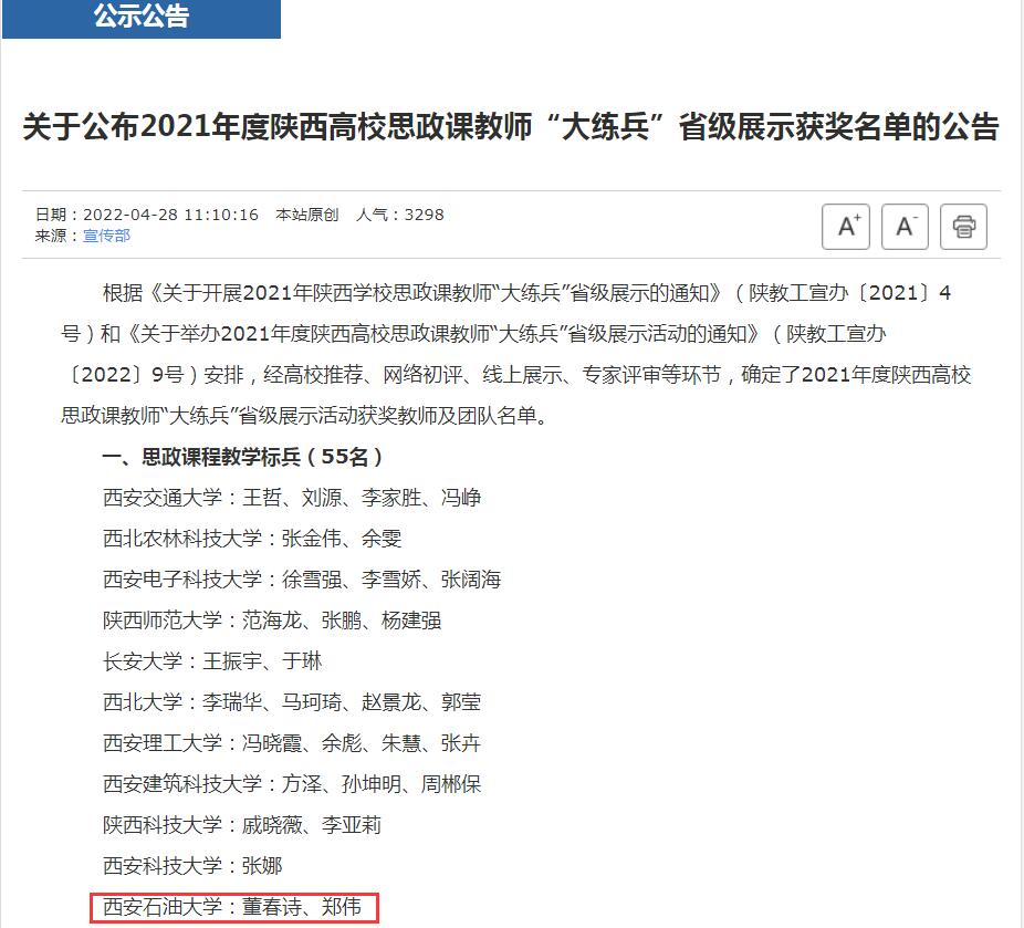 2021年度陕西高校思政课教师“大练兵”省级展示活动获奖名单于4月28日公布,我校马克思主义学院教师董春诗、郑伟获得思政课程教学标兵称号,张莉、王婉菲获得思政课教学团队标兵称号,孟晓蕾获得思政课程教学能手称号。