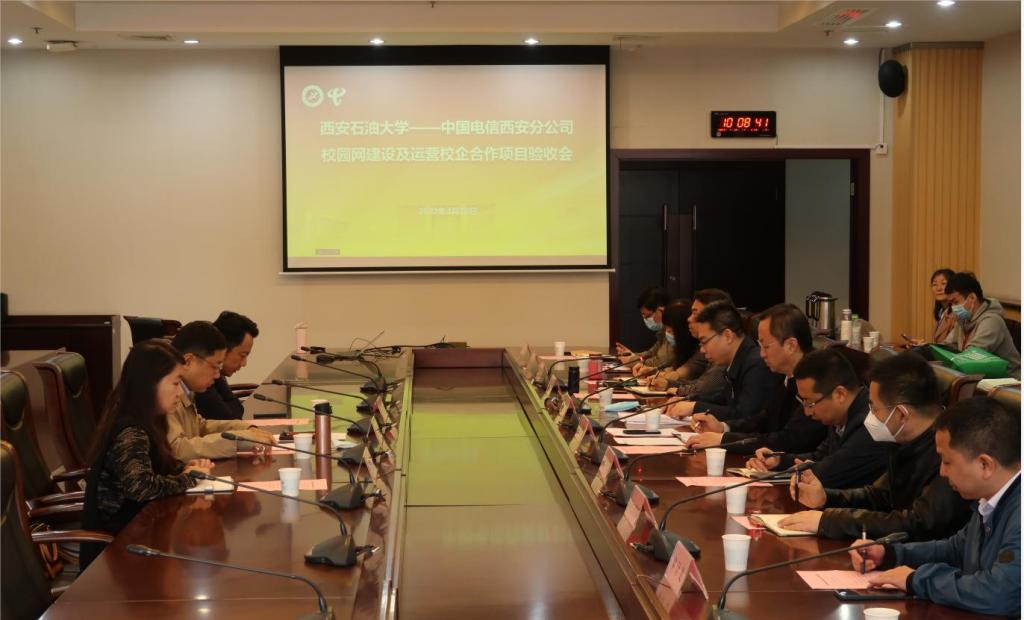 4月28日上午,学校在鄠邑校区图书馆第二会议室召开“西安石油大学—中国电信股份有限公司西安分公司 校园网建设及运营校企合作项目”验收会。学校网络安全与信息化工作领导小组副组长、副校长张荣军,中国电信股份有限公司西安分公司副总经理杨帆出席会议,学校党政办公室、学生工作部(处)、保卫部(处)、审计处、财务处、国有资产处、资产经营处、基建处、后勤处等学校网络安全与信息化工作领导小组成员单位负责人以及西安电信校园运营中心总经理王建成、总监杨莎莎参加会议,会议由信息中心主任王学龙主持。