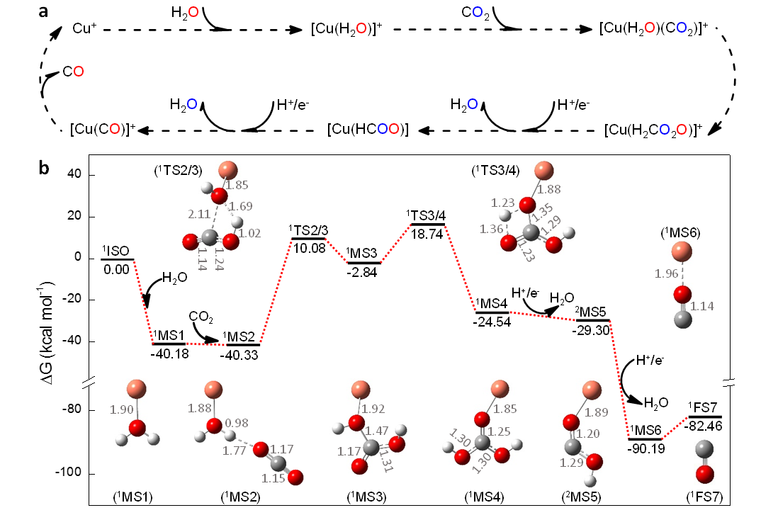 按照传统观点,二氧化碳还原转化为一氧化碳中的O原子来自二氧化碳。该研究中,科研人员发现还原反应生成一氧化碳中的O原子来自反应体系催化剂表面的配位水分子,而非二氧化碳本身。该结论不仅适用于质在线反应过程,也适用于实际二氧化碳的电催化还原反应和工业化水煤气逆反应过程,说明该发现具有一定的普适性。同时发现相比于金属催化剂Cu+,当[Cu(H2O)]+作为催化剂时,二氧化碳还原为一氧化碳的反应效率可提高两个数量级。为了深入探究该反应过程,科研人员通过改造质谱仪对反应中间体的捕获、同位素对比实验和密度泛函理论的计算,详细阐述了二氧化碳在[Cu(H2O)]+催化作用下生成一氧化碳的机制。该工作不仅为深入阐述二氧化碳还原机理提供了方法学基础,也为详细了解水在二氧化碳还原过程中的作用提供了着眼点。