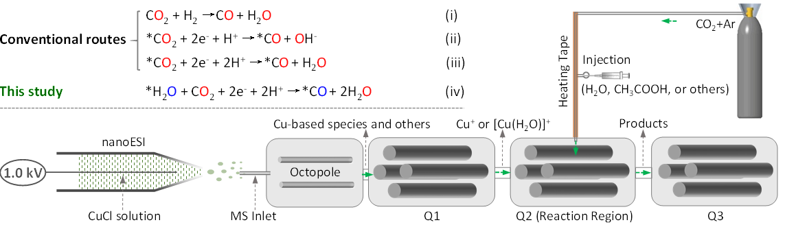 近日,我校化学化工学院张智平教授团队在二氧化碳还原反应机理研究方面取得了重要进展,相关工作发表在《自然-通讯》(Nat. Commun.2022, 13, 2577)。本工作中,研究人员通过对商品仪器的改造,巧妙地将三重四极质谱仪第一级四极杆作为特定催化剂离子的实时分离器、第二级四极杆作为二氧化碳还原过程的微反应器、第三级四极杆将反应涉及的中间体和产物在线传递到检测器中,采用同位素标记化合物作为反应的示踪剂,通过对质谱仪气路系统的特殊设计,直接将常压电离源电离的催化剂铜离子及其配合物离子分离出来与二氧化碳气体在线相互作用,通过对各种实验条件下反应中间体及产物的在线捕获及同位素对比实验,详细阐释了二氧化碳还原为一氧化碳的反应机理。
