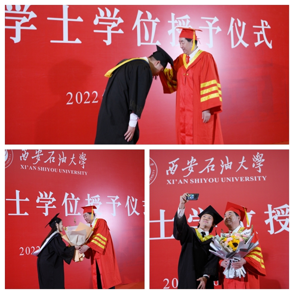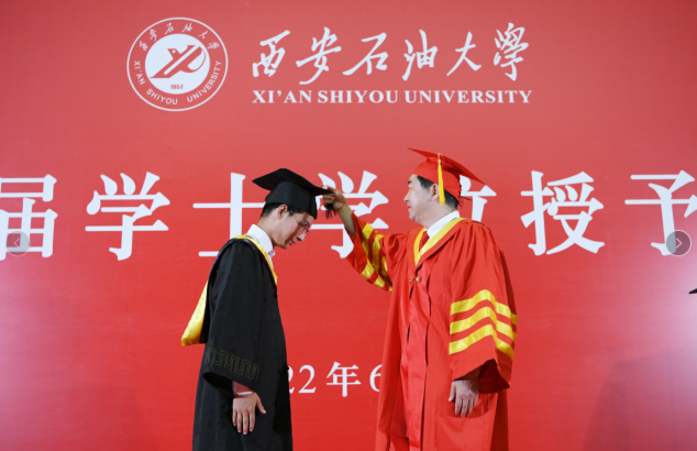 6月27日上午,西安石油大学2022届优秀毕业生代表学士学位授予仪式在鄠邑校区弘石学术报告厅隆重举行。校长、校学位评定委员会主席李天太,副校长、校学位评定委员会副主席陈军斌出席学士学位授予仪式。学士学位授予仪式由校党委副书记、校学位评定委员会副主席张木主持。鄠邑校区管理办公室、学生工作处、教务处等相关职能部门负责人、各院(系)负责人、208名优秀毕业生代表参加授位仪式。