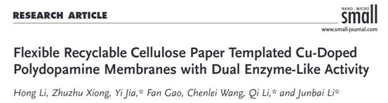 近日,我校化学化工学院李红教授课题组在聚多巴胺基仿生酶构建研究方面取得了重要进展,相关工作分别发表在Small(中科院一区,IF=15.153)和Journal of Colloid and Interface Science(中科院一区,IF=9.965)期刊上。该课题组报道了一种以氧化纤维素为模板铜掺杂聚多巴胺膜的构建方法。制备得到以氧化纤维素为载体、以铜离子为活性中心的薄膜,其具有两种天然酶类似的活性,包括漆酶和过氧化物酶。薄膜能够有效地将对苯二酚催化形成苯醌,催化效率是天然漆酶的3倍。并且,该薄膜具有类似过氧化物酶的活性,能够催化过氧化氢对3,3',5,5'-四甲基联苯胺的氧化反应,生成蓝色的氧化产物,进而应用于过氧化氢和抗坏血酸的灵敏检测。与天然酶相比较,仿生酶还具有成本低、易于储存和运输、稳定性好及可循环使用等优点。相关成果以“Flexible Recyclable Cellulose Paper Templated Cu-Doped Polydopamine Membranes with Dual Enzyme-Like Activity”为题发表在化学权威期刊Small上(DOI: 10.1002/smll.202202405)。