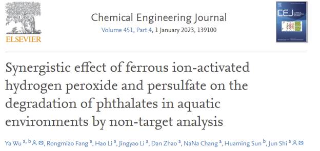 近日,我校化学化工学院吴亚副教授、史俊教授在化工领域TOP期刊《Chemical Engineering Journal》( IF 16.744 )上在线发表了题为“Synergistic Effect of Ferrous Ion-Activated Hydrogen Peroxide and Persulfate on the Degradation of Phthalates in Aquatic Environments by Non-target Analysis”的研究文章(DOI:10.1016/j.cej.2022.139100)。