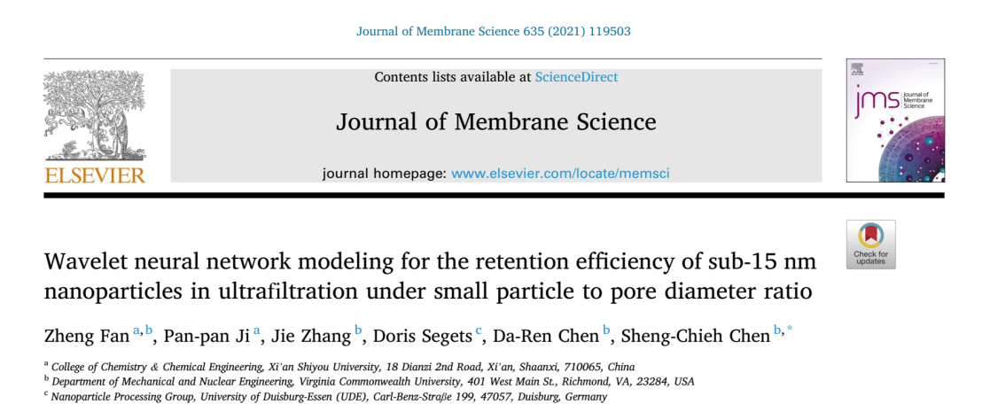 近日,我校化学化工学院范峥、黄风林科研团队以范峥为第一作者、西安石油大学为第一单位在国际膜科学领域学术期刊《Journal of Membrane Science》(JCR、中科院分区双一区TOP期刊,IF=10.53)上发表题为《Wavelet neural network modeling for the retention efficiency of sub-15 nm nanoparticles in ultrafiltration under small particle to pore diameter ratio》的高水平论文。