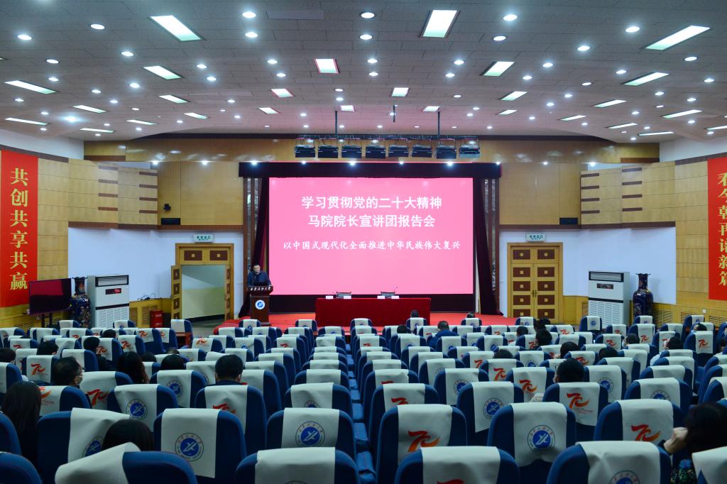 为深入学习宣传贯彻党的二十大精神,根据省委、省委教育工委统一部署,11月14日下午,我校在雁塔校区会议中心学术报告厅举行党的二十大精神“马院院长宣讲团”报告会,全省党的二十大精神“马院院长宣讲团”成员、我校马克思主义学院院长张海涛教授作宣讲报告。全校思政课教师、学工干部代表及师生代表分别在雁塔校区主会场及各校区视频会议分会场参加学习。报告会由校党委副书记雷西合主持。