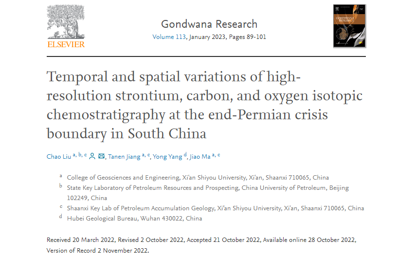 近日,我校地球科学与工程学院教师刘超在国际地学顶级期刊Gondwana Research在线发表了题为“Temporal and spatial variations of high-resolution strontium, carbon, and oxygen isotopic chemostratigraphy at the end-Permian crisis boundary in South China”的学术论文,探讨了二叠系/三叠系之交生物大灭绝的相关重要科学问题。