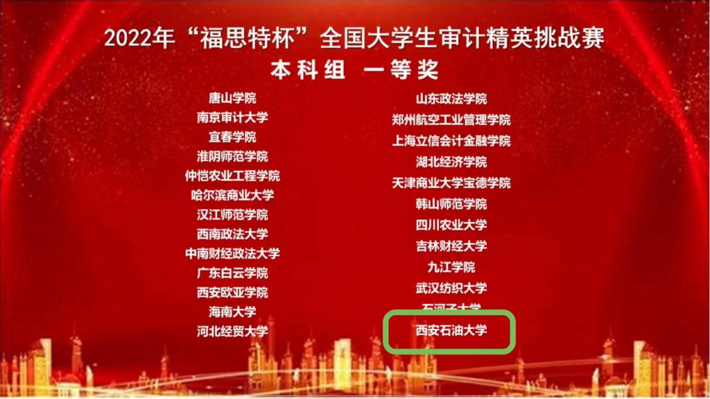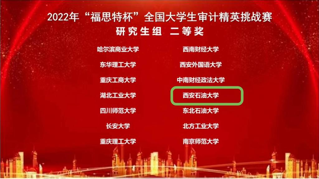 本次比赛采用线上的方式进行,来自西南财经大学、南京审计大学、中南财经政法大学、上海立信会计金融学院、东北石油大学等340所院校的390支队伍参加了本次比赛,1800余名师生同台竞技,其中研究生组72支代表队,本科组258支代表队,高职组60支代表队。我校经济管理学院会计系黄莉老师指导的2019级本科生李文文、吴珊珊、李洋获得本科生组一等奖,黄莉、侯晓靖老师指导的2022级研究生王萍、王严、白玉获得研究生组二等奖,为我校参加该项赛事以来取得的最好成绩。