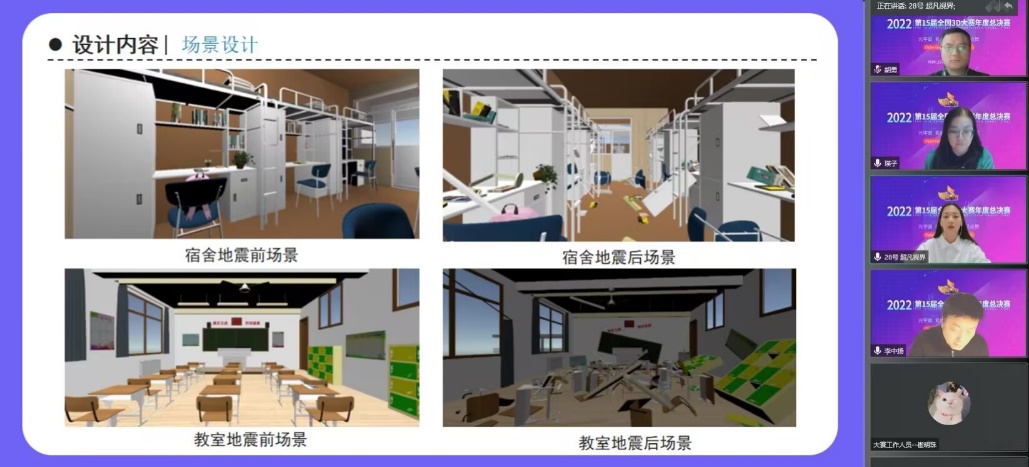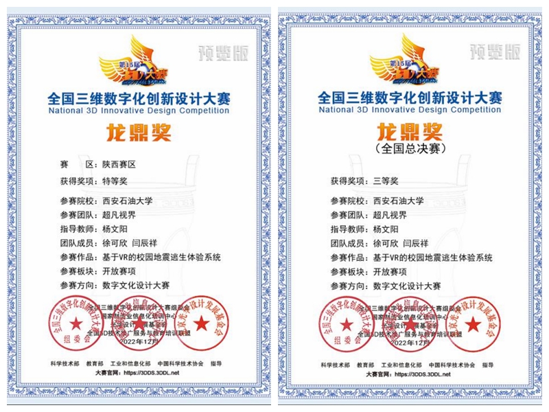 结合当前疫情防控形势,全国总决赛采用了线上为主的方式进行,邀请百余位行业/院校/企业专家参与了总决赛作品的评审工作,评审主要考察设计创意性、技术应用创新性、工程实用性、美学、商业可开发价值、社会价值等多项因素。此次大赛开辟四类参赛作品类型:工业、文化、人居设计以及元宇宙创建大赛,参赛主题依据不同类型各有侧重和特色。我校计算机学院学子的数字文化设计类作品《基于VR的校园地震逃生体验系统》,以科普地震逃生知识和技能为背景,通过VR技术让体验者更为直观生动的感受到地震发生时的情况,以新颖的方式增强学生面对地震突发时的应急能力,对地震应急救援有较好的应用价值。