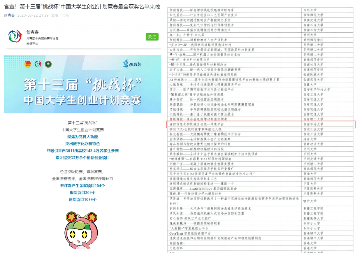 3月17日至19日,第十三届“挑战杯”中国大学生创业计划竞赛终审决赛在北京理工大学举行。经过校赛、省赛和国赛角逐,由我校聂向荣、张荣军、赵凯、杨懿老师指导,石工教改2001班梁欢同学负责的《油田信息化和机械自动化一体化平台》项目,荣获科技创新与未来产业组别国家级铜奖。