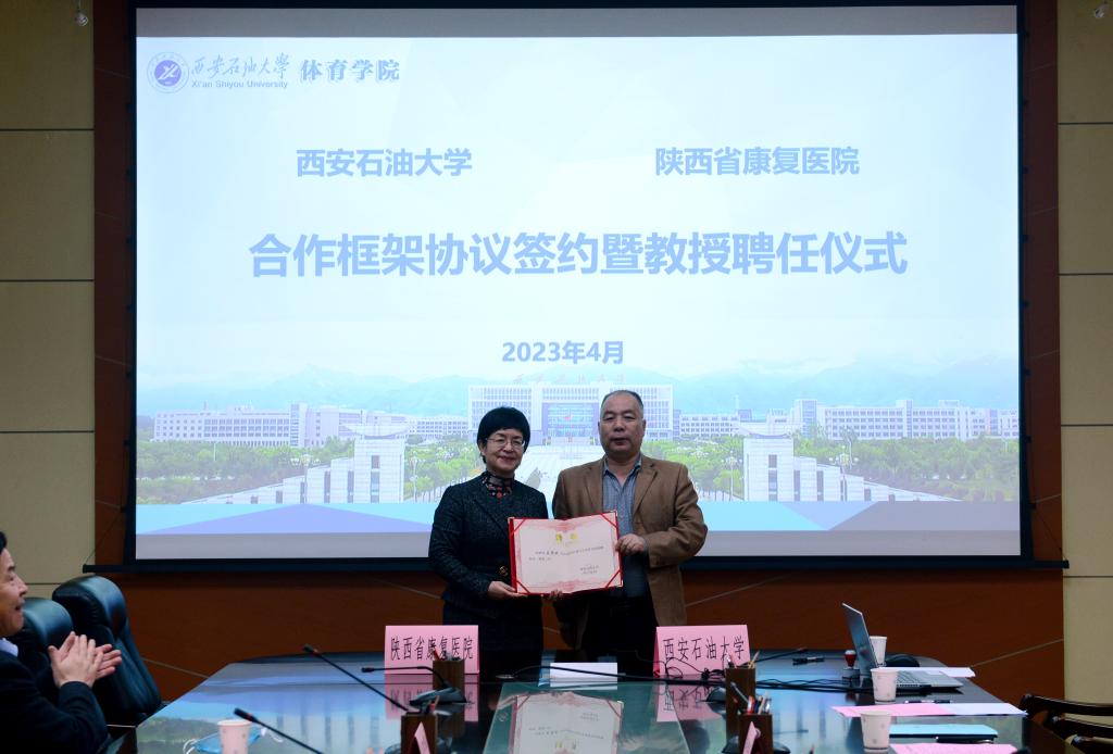 会上,陈军斌代表学校向陕西省康复医院研究生联合培养基地授牌,并向石秀娥颁发特聘教授聘书。