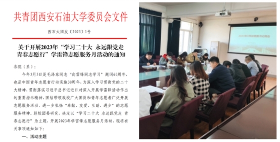 一是发挥共青团的组织优势,面向全校青年学生发布《关于开展2023年“学习二十大 永远跟党走 青春志愿行”学雷锋志愿服务月活动的通知》,在学校各级团组织集中开展为期一个月的“学雷锋”志愿服务活动,活动范围覆盖关爱留守儿童、乡村振兴、助残助老、生态环保、文明校园等方面。二是理论联系实际,推动工作提质增效,组织各院系团委书记、团支部书记学习习近平总书记对深入开展学雷锋活动的重要指示精神,并结合实际对在我校如何推进“学雷锋”志愿服务工作取得实效进行了研讨和工作部署。三是推进志愿服务工作组织规范化建设,推荐教师和学生代表参加3月25日举行的陕西省青年志愿者协会第五次会员代表大会,推荐我校青年志愿者协会入选“陕西省青年志愿者协会理事单位”。