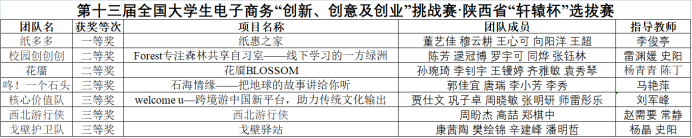 5月14日,第十三届全国大学生电子商务“创新、创意及创业”挑战赛(简称三创赛)省赛在延安市黄陵县落下帷幕,此次赛事由延安市人民政府与西安交通大学共同主办,共有来自全省高校数百支团队参加,经过激烈角逐,我校经济管理学院、土木工程学院、地球科学与工程学院师生代表队获得一等奖1项,二等奖2项,三等奖4项。