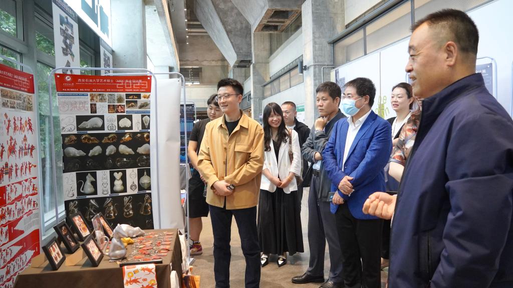 开幕式结束后,同学们在各自展位前向与会领导嘉宾详细介绍了自己的创作理念和研究方法,从技艺融合的角度综合性开展老旧矿业社区人居环境更新设计、工业遗产历史风貌区街坊改造设计、非物质文化遗产保护与传承研究、民俗民艺拓展应用等实践创新设计,得到了与会嘉宾的赞扬和好评。