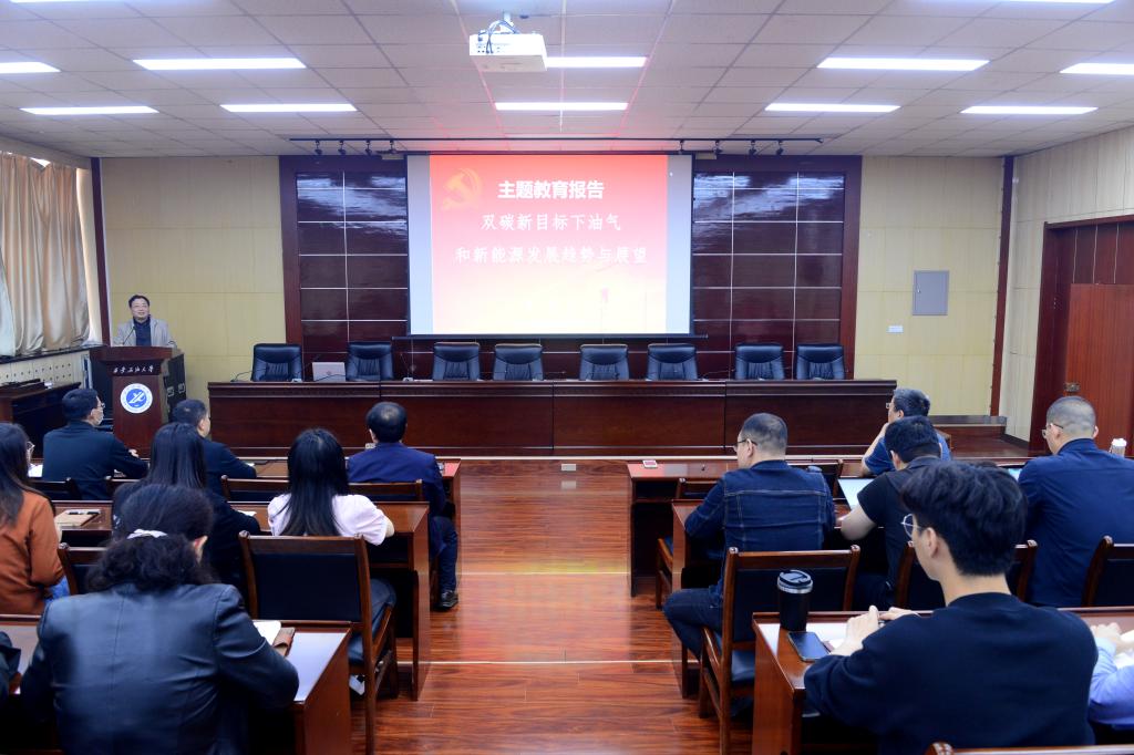 李天太在讲授中强调了本次学习贯彻习近平新时代中国特色社会主义思想主题教育的总要求、根本任务、5个目标、着力解决6个方面突出问题,并从双碳新目标、世界油气发展趋势、我国油气发展趋势、石油天然气勘探开发关键技术和新能源发展展望五个方面出发,指出当前我国正处于实现“双碳”目标、构建“清洁低碳、安全高效”能源体系的关键时期,做好“碳达峰、碳中和”工作要加快调整优化产业结构、能源结构。我校作为以石油石化为特色的多科性普通高等学校,要深刻把握新能源技术发展水平与趋势,始终推进学校向高水平教学研究型大学迈进,持续强化和拓展学校优势学科领域、落实“双一流”建设,坚持立德树人根本任务,坚持科技创新“四个面向”,着力培养“三和”+“三碳”人才,服务于国家能源建设。