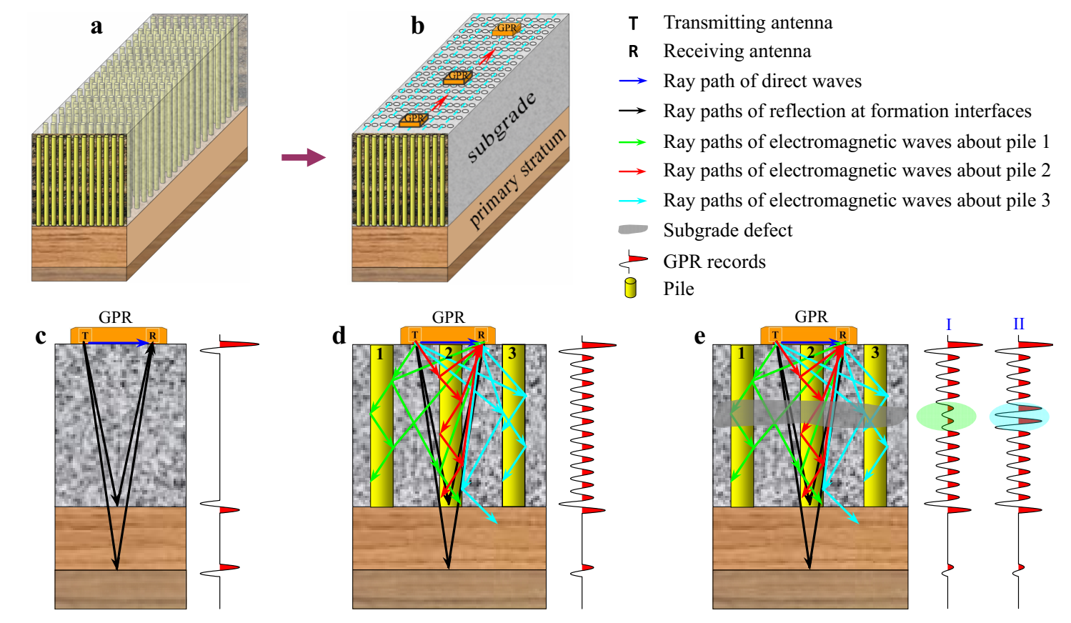图1 群桩加固软土地基的地质模型及其GPR响应特征