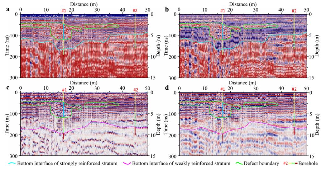 针对上述困难和挑战,研究团队历时数年研究,通过理论推导、模型构建、数值模拟、软件开发和现场试验等手段,创新提出了将桩基缺陷检测转化为地基加固质量评价的思想,构建出桩群加固地基的地质模型,揭示了群桩条件下地基的地质雷达(Ground Penetrating Radar,GPR)响应特征,研发出GPR多属性信息提取软件新技术,并建立了桩基缺陷检测及地基加固质量评价的GPR技术体系。依托甘肃省安临高速公路建设项目,研究团队开展了GPR技术在DCM桩缺陷检测及地基加固质量评价中的应用实践。研究结果表明,通过融合单道波形、多道剖面、GPR属性和钻孔等信息,可准确识别出桩长和强/弱加固层、原生地层、缺陷地层的埋深及范围等。该研究成果为软土地基的DCM桩加固质量评价提供了一种快速、高效和经济的技术解决方案,填补了桩群数量大、桩距小、密度高等情况下桩基缺陷高效检测的技术空白。