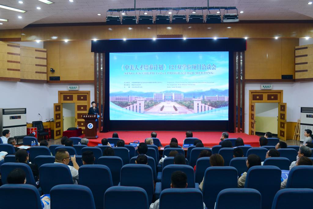 6月16日,由中国教育国际交流协会中教国际教育交流中心主办,我校承办的2023年《中美人才培养计划》121双学位项目洽谈会在我校雁塔校区会议中心学术报告厅举行。陕西省教育厅二级巡视员董侠,我校副校长张荣军,中教国际教育交流中心主任张靖、副主任吴琴,美国州立大学与学院学会及美国加州州立大学圣贝纳迪诺、美国塞勒姆州立大学等121项目7所美方高校代表,全省27所高校代表,我校国际交流与合作处、教务处、国际教育学院及各院(系)负责人等近百名中外嘉宾出席会议,共商中美教育合作交流大计。