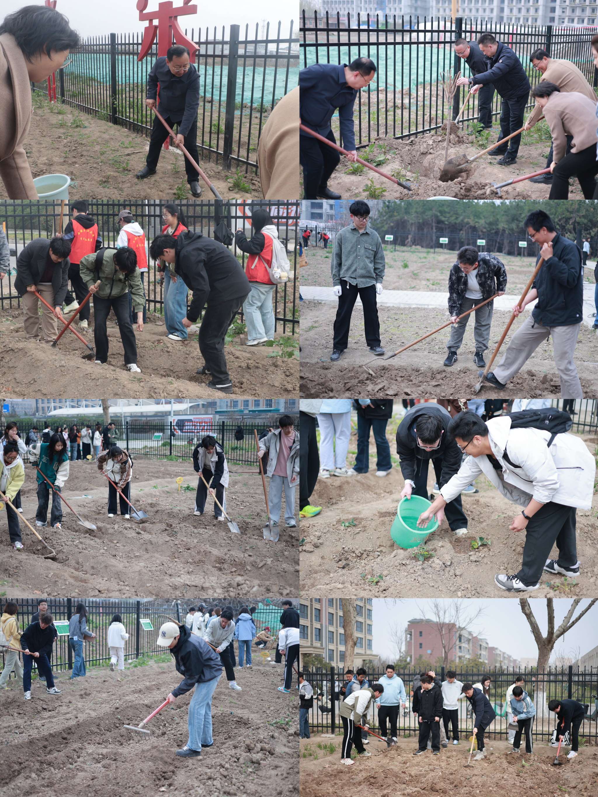 动员结束后,现场师生迅速投入到植树及劳动耕作中。大家分工协作、干劲十足,挥锹铲土、扶苗填坑、提水浇灌等各个环节衔接有序,大家用汗水浇灌土地,用双手创造价值,劳动场面繁忙而有序。