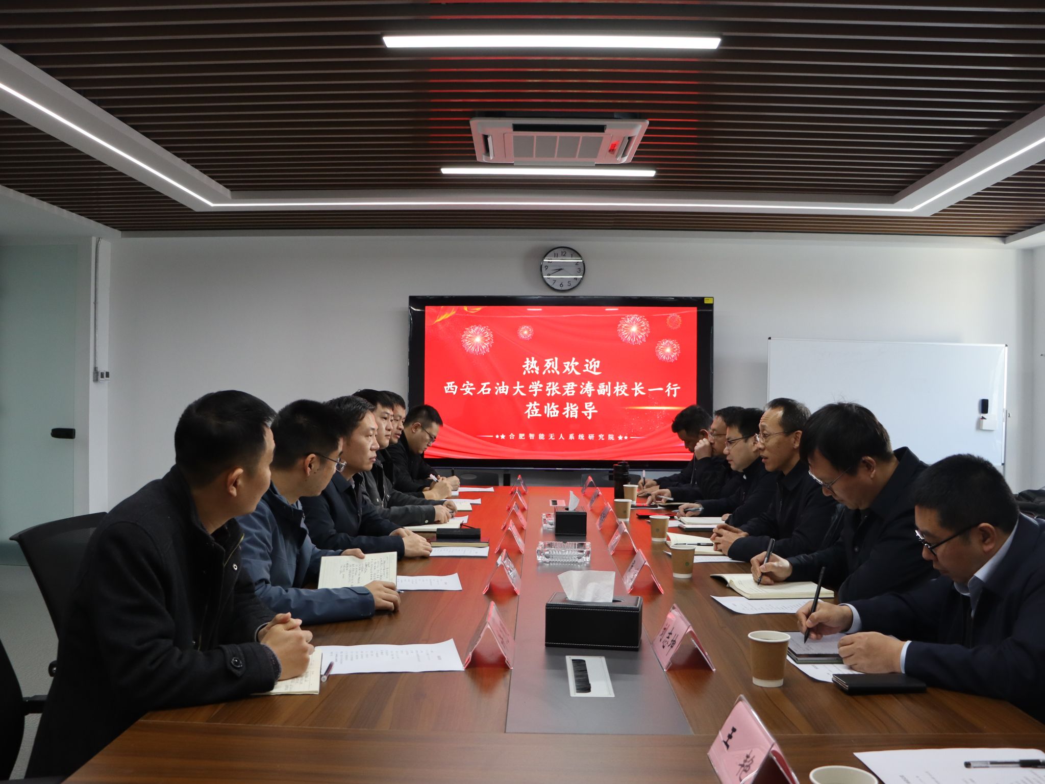 石敏超院长代表研究院对张君涛一行的到来表示热烈欢迎,并提出了研究院与西安石油大学的合作契合双方发展需求,期待以此次签约为契机,建立长效合作机制,实现优势互补、资源共享,共同推动智能无人系统领域人才培养与产业发展。