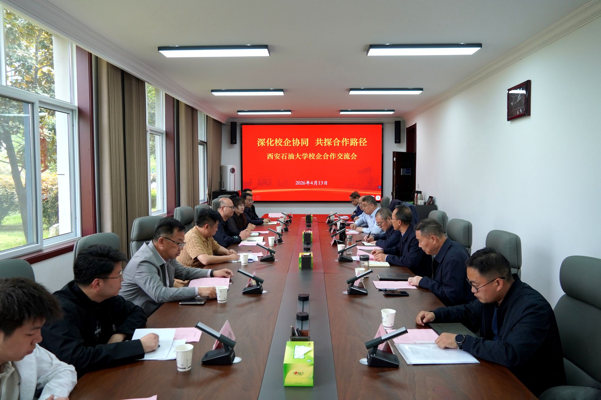 4月13日下午,我校与定边县产业园区管委会、定边县定庆资源能源管理服务有限公司、陕西智诚运势实业集团有限公司校企合作交流会在鄠邑校区第五会议室召开。校党委书记常江,腐植酸生态项目技术团队负责人田原宇教授,定边县产业园区管委会党工委委员、副主任魏延平,定庆资源能源管理服务有限公司副总经理白慧萍,陕西智诚运势实业集团有限公司总经理冯智及公司相关负责人出席会议。副校长张君涛主持交流会。会议以“深化校企协同,共探合作路径”为主题,聚焦产学研融合、技术创新与人才培养,共谋校地、校企合作新篇章。